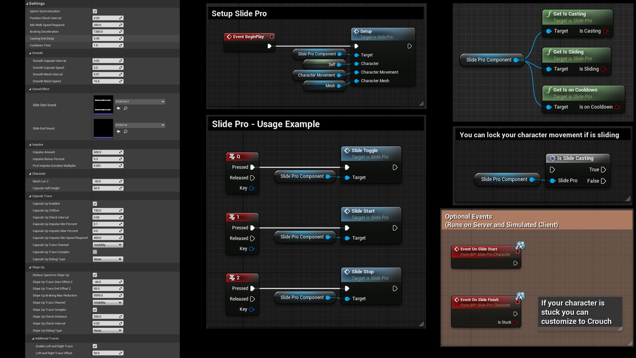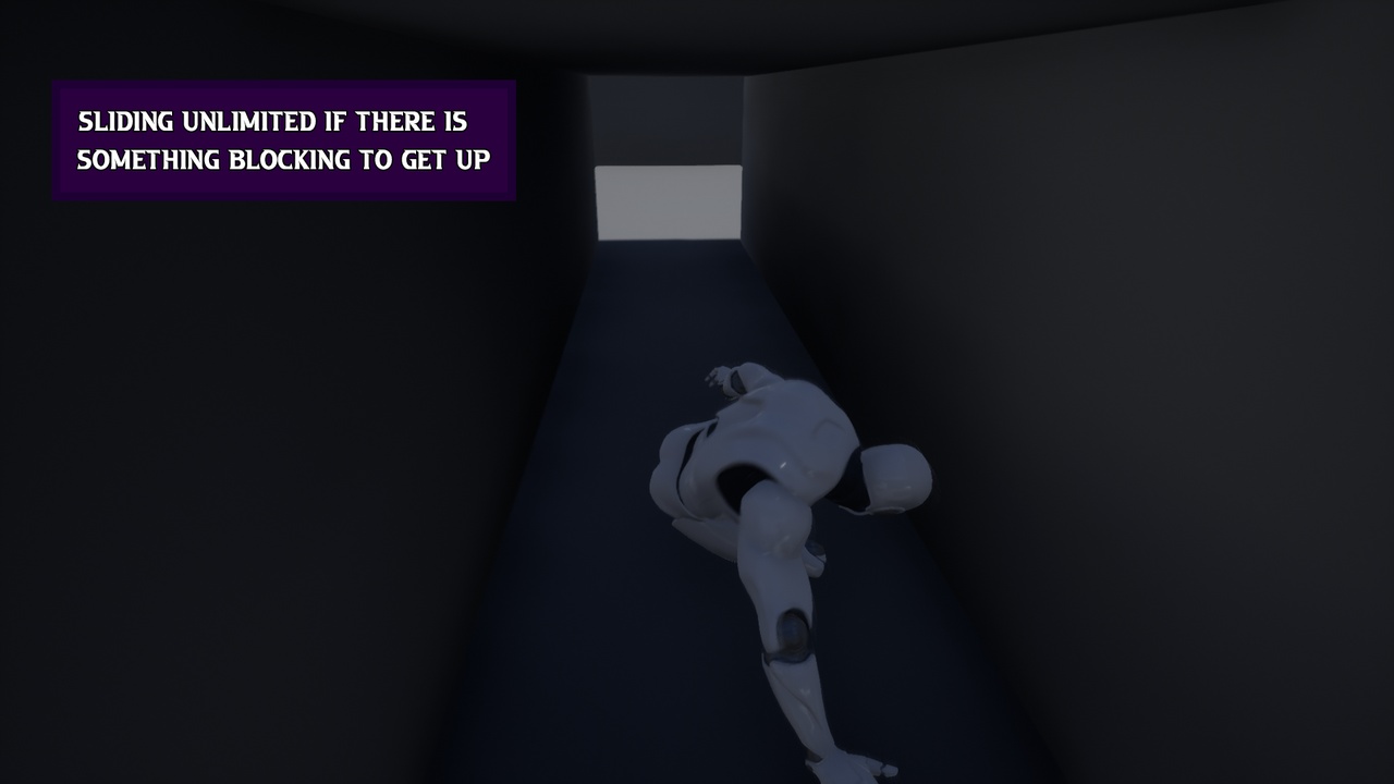Based on character forward direction to move instantly. You can enable your character to sliding unlimited if there is something blocking to get up.