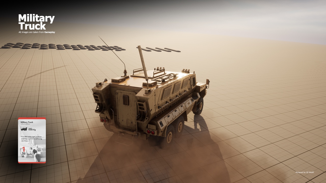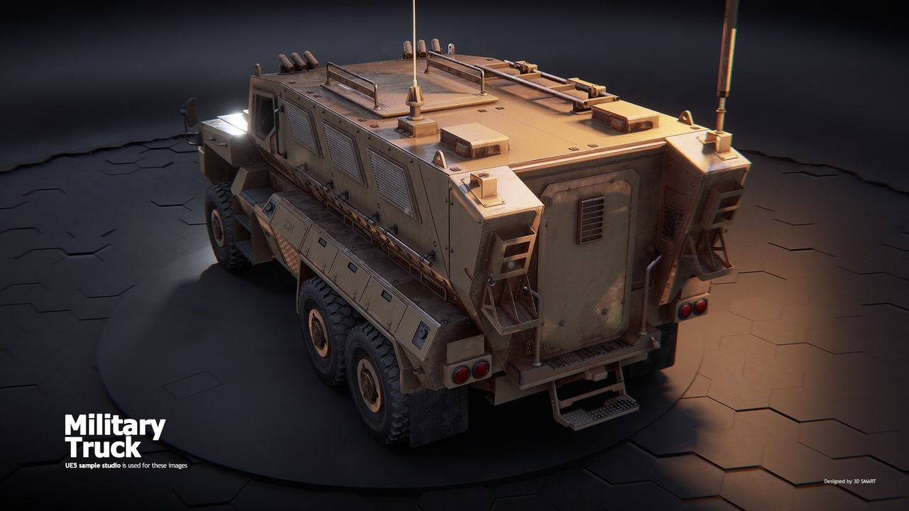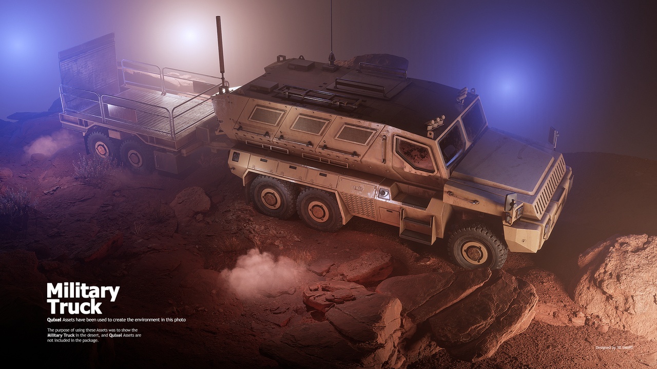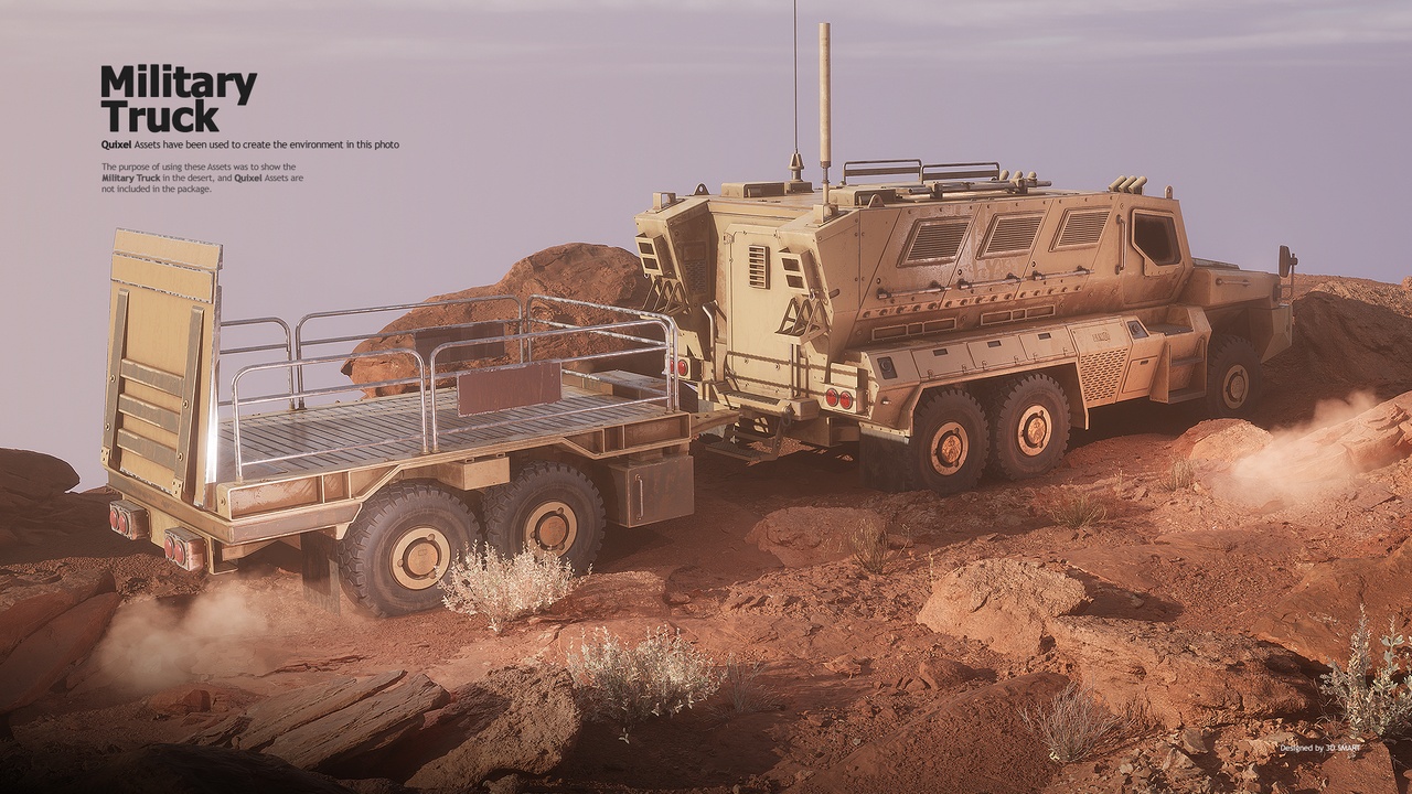 Note: Quixel assets were used to create the environment in some photos in the gallery. The purpose of using these assets was to show the Military Truck in the desert, and Quixel assets are not included in the package.