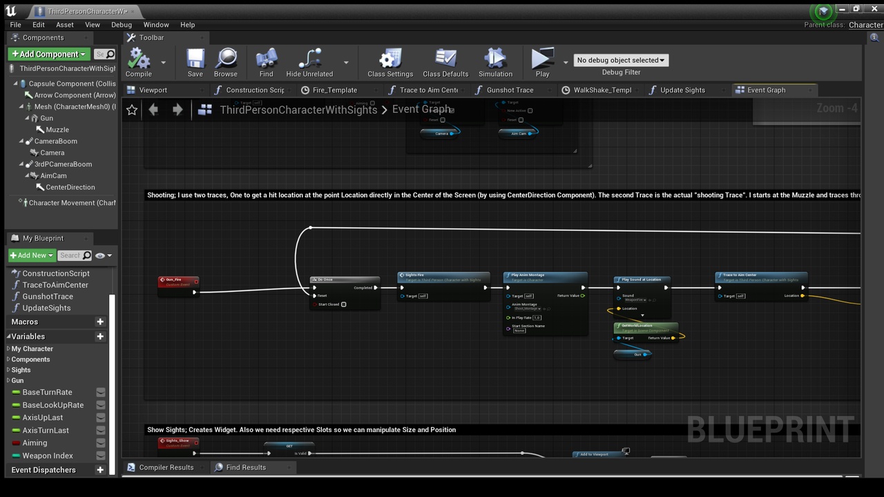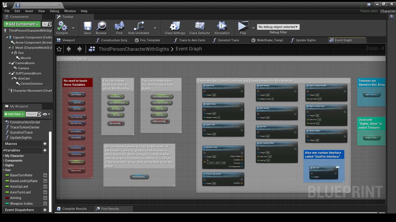 This project is centered around the dynamic crosshairs. Do not expect a full-grown third person shooter template. However you could use this as a base to build one. Everything is commented in Detail but some experience in blueprint scripting / Unreal Engine is required if you want to make changes or implement this into another project.