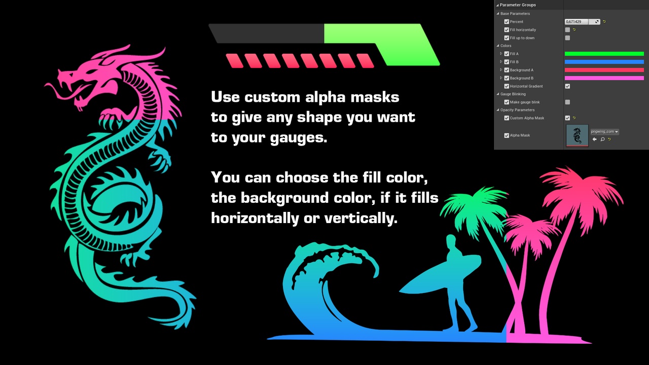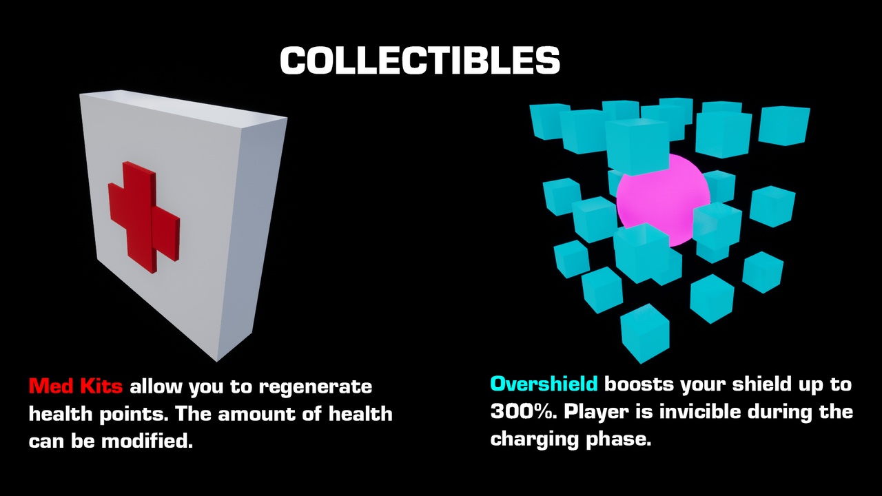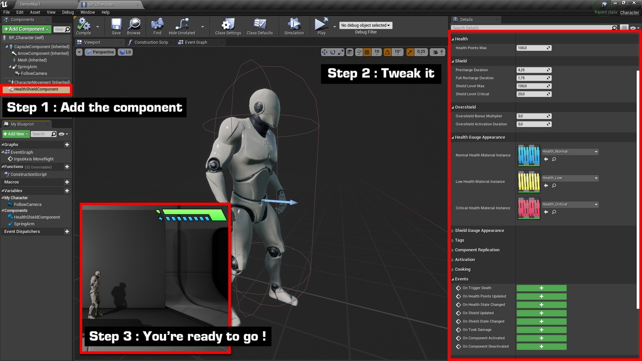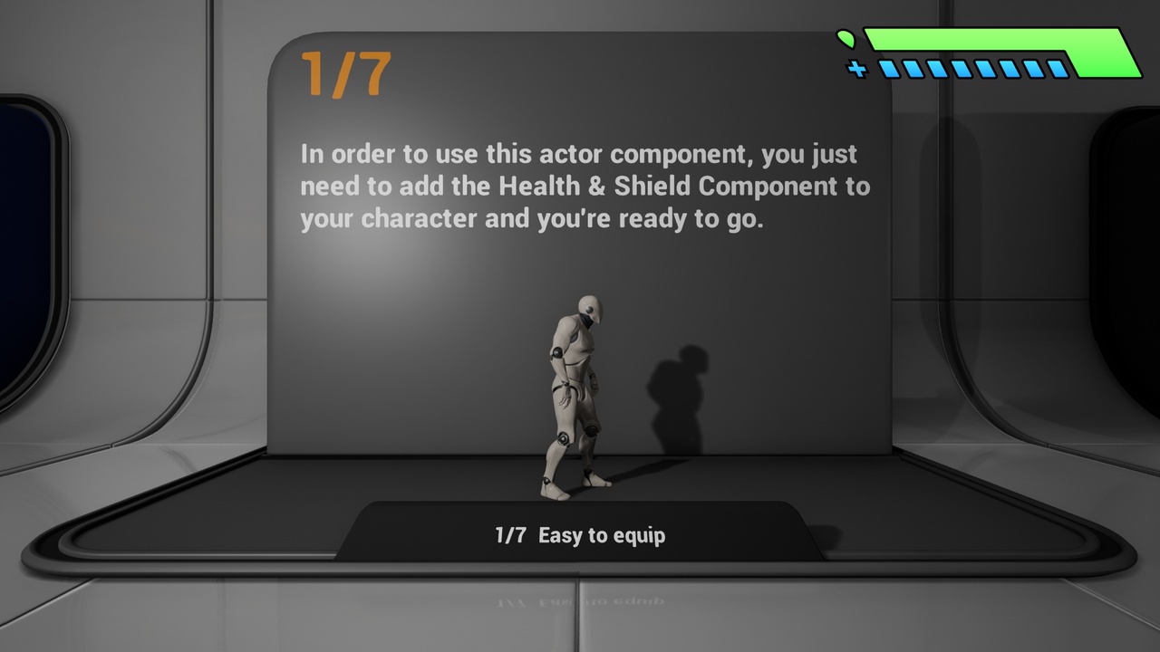 Just add the actor component to your player, customize the appearance of the gauges, and they will be automatically added to the viewport during gameplay. The project comes with a demo map that will explain to you everything you need to know in order to use it in your own game, from dealing damage, to regenerating health, regenerating shield and using the overshield.