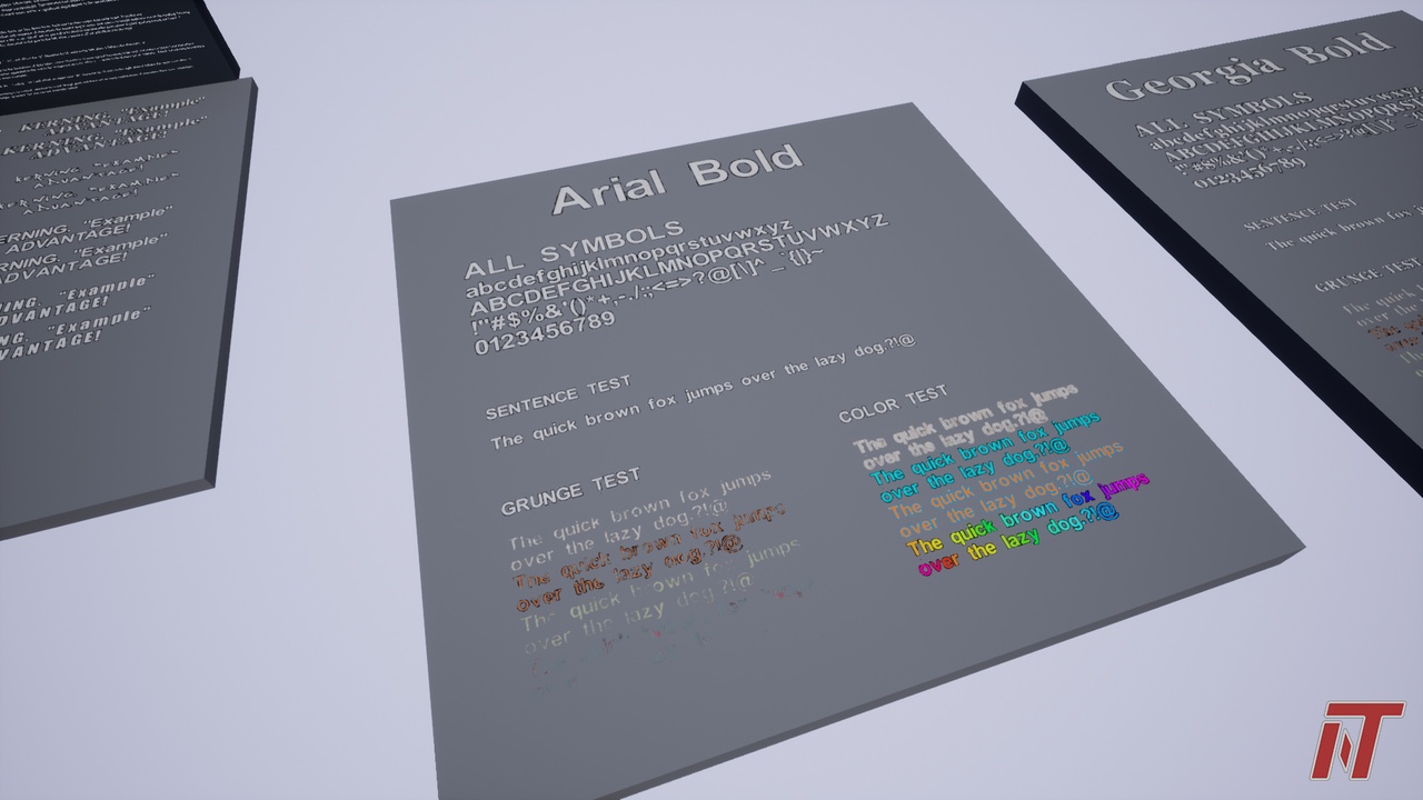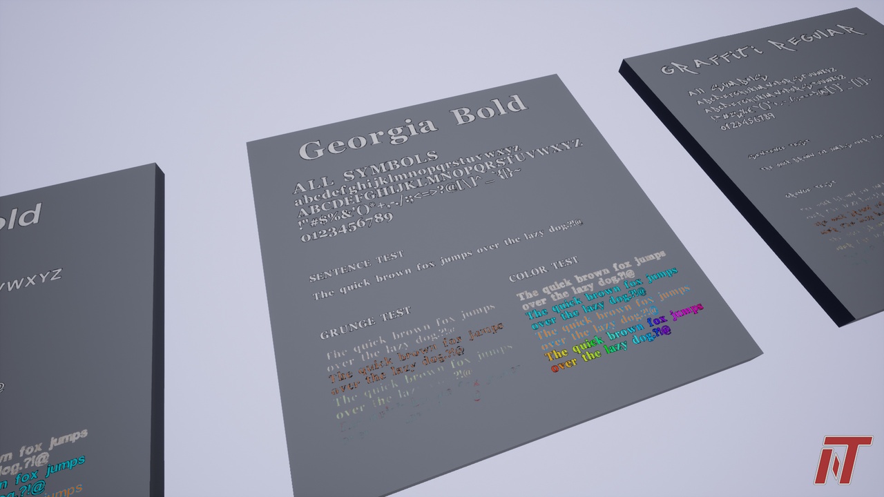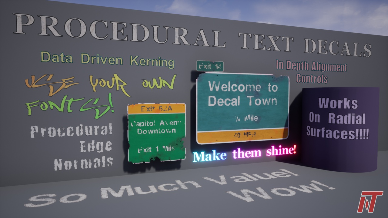 - Uses blueprints and dynamic material instances in combination with specially formatted flipbook font textures to generate infinite variation across each placement instance. The feeling of custom content generation in a fraction of the time.