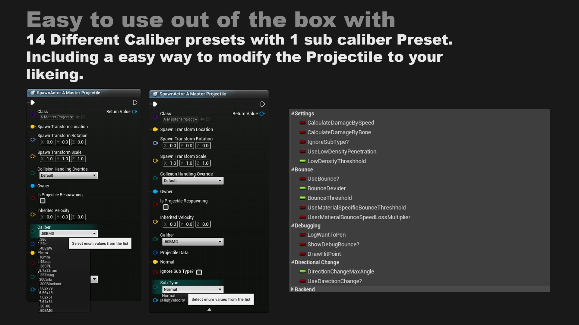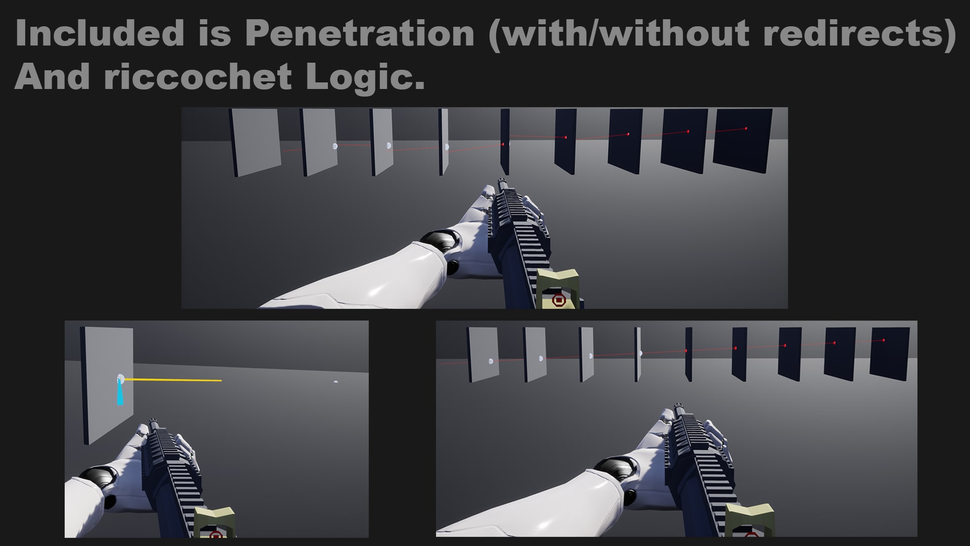 This bullet penetration system is a Blueprint based system, which includes features like Projectile penetration (with internal Projectile Redirects) and bullet ricochet logic. To give you a head start, the project includes 41 Physics Materials, which handles the density of the Material. On top of that, it also includes 13 already created Projectiles, which are fully set up and ready to be used.