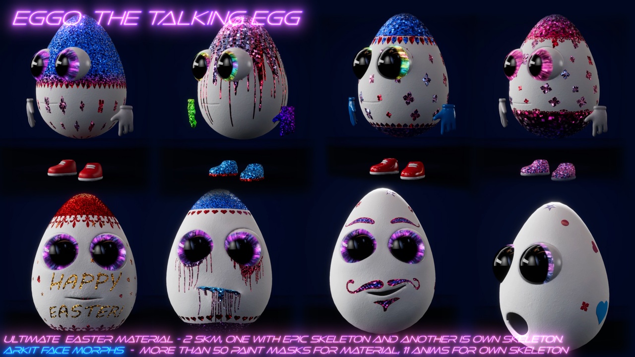 Eggo is a Talking Egg character with 2 SKM versions. First one is Epic skeleton rigged with gloves and shoes. Second is jumping egg version. Both have arkit morph targets for face mocap and supports ultimate easter material.