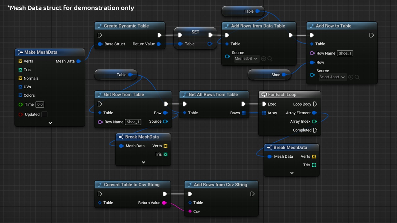 Use “Add Rows from Data Table” and “Get Row from Table”. Simply right click on the Table pin to create a variable (Promote to Variable) All functions are in the category “Dynamic Datatable”