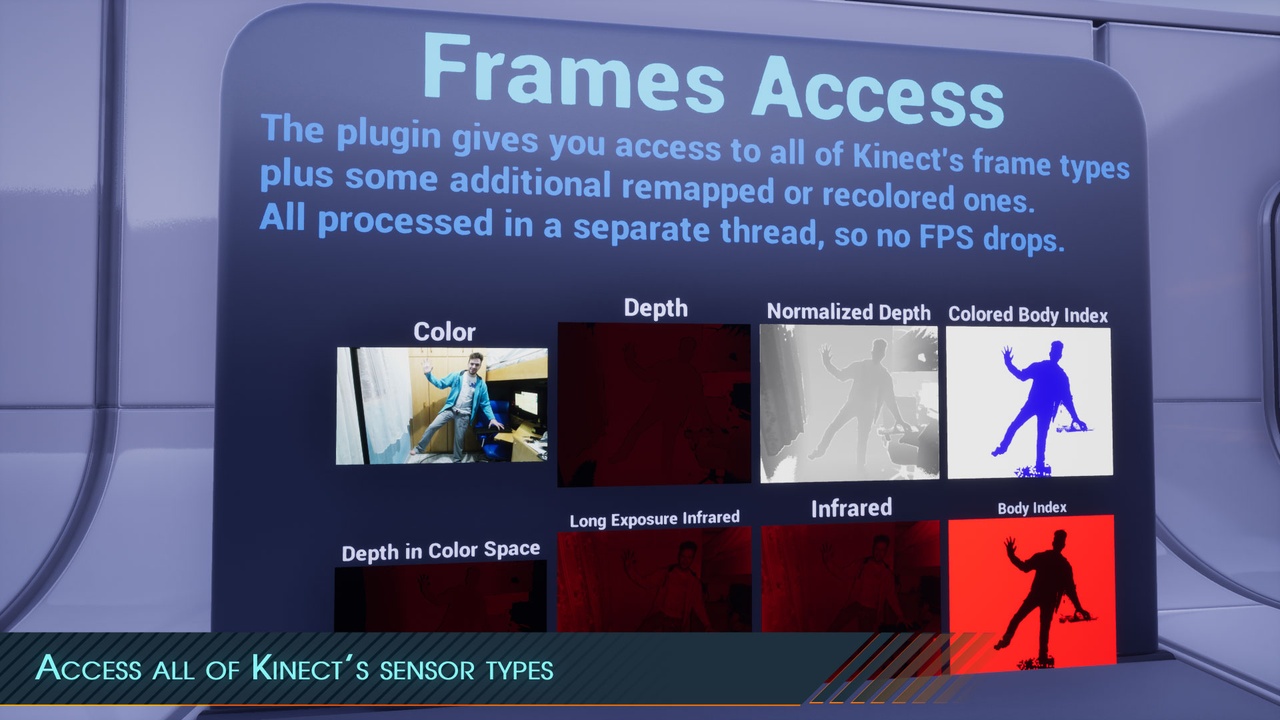 The plugin was created with performance and usability in mind, so you can track all 6 possible users, their faces and enable all of the Kinect’s frame types (color, depth, infrared etc) at the same time with almost no hit in performance. Sensor polling is made in its own thread. The frames textures (color camera, depth camera, IR and their variations) are TextureRenderTarget2D (UE5+ only. A custom texture format was used on UE4), which is compatible with materials, UMG Widgets and whatnot. There are functions to access the textures pixel values from Blueprint as well.