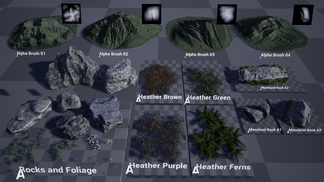 • 8192×8192 Alpha Brush Texture is included that can be used to sculpt Moorland mountains directly into the landscape.