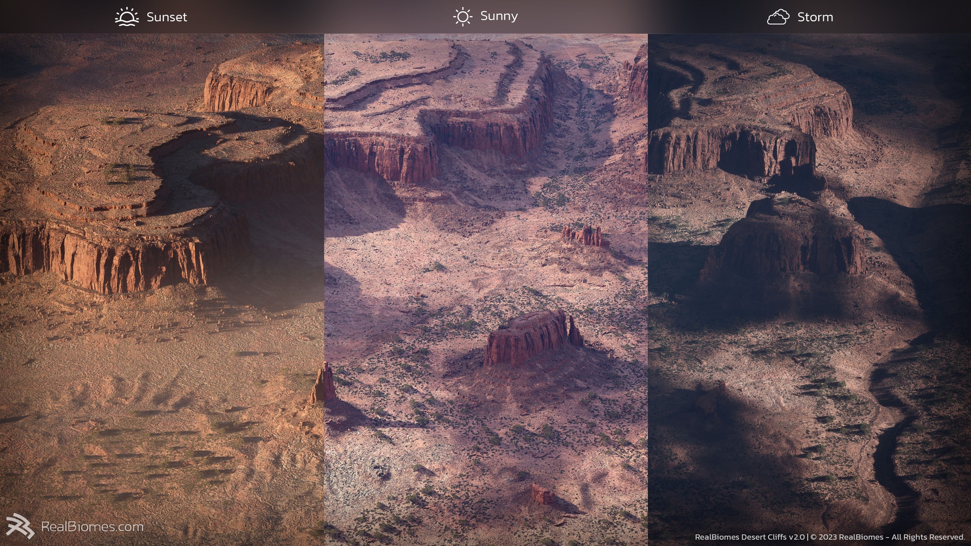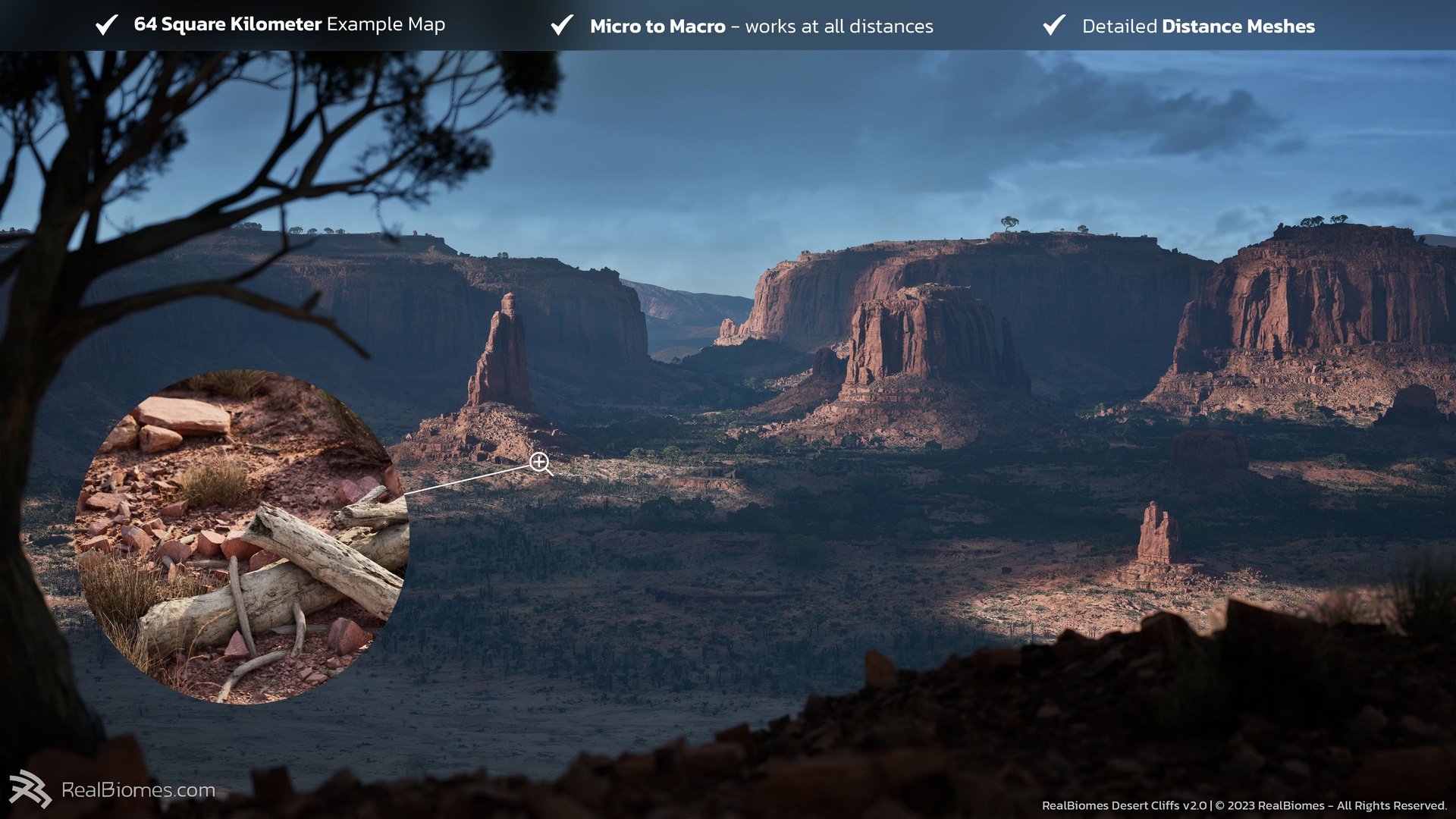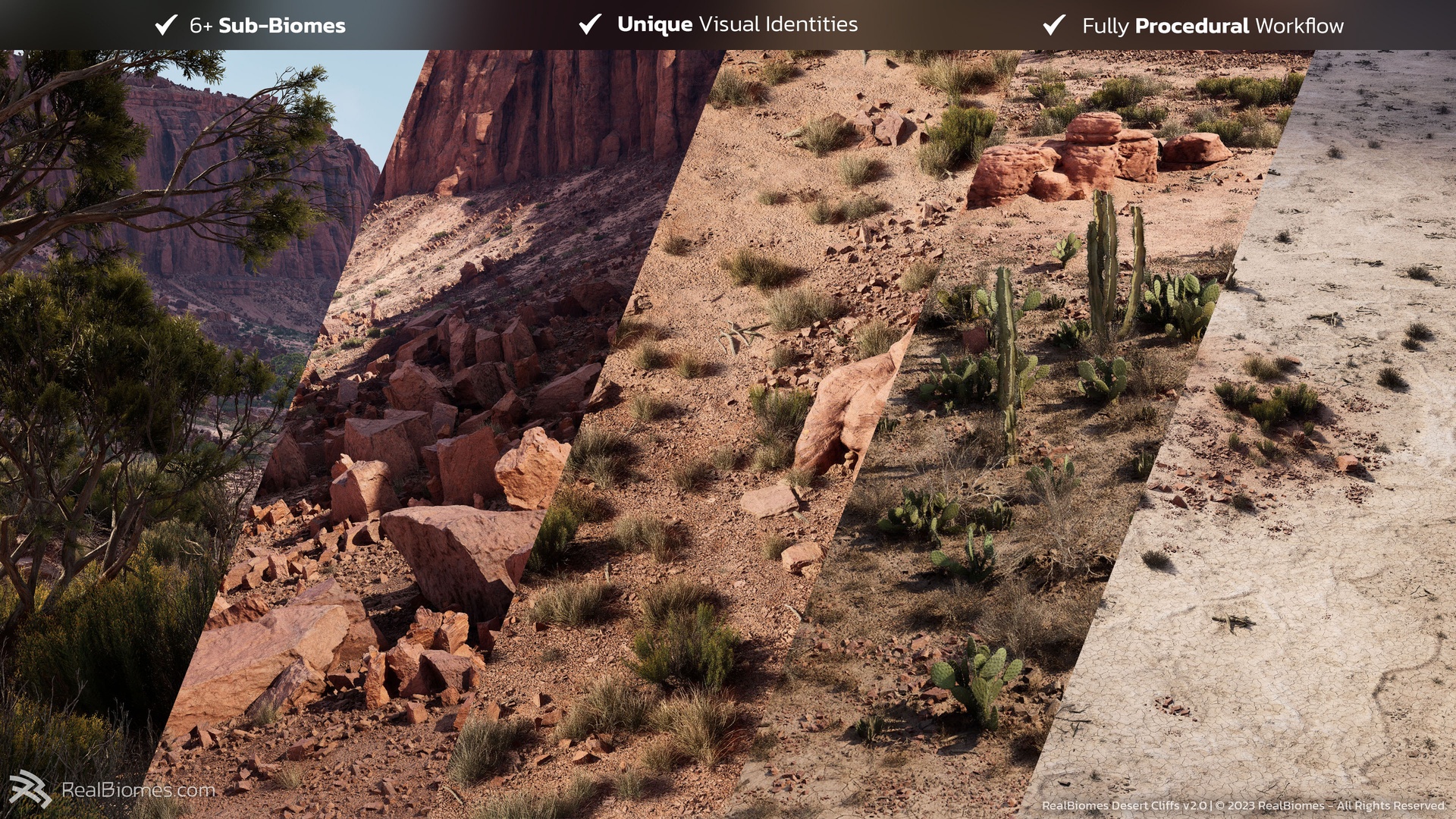 Based on the famous Monument Valley, this epic desert biome gives you everything you need to create huge open worlds with massive scale and incredible detail. Explore our massive 64sqkm example map or generate your own world with our intuitive BiomePainter workflow to quickly and easily procedurally create anything from lush desert forests, dead cracked mud, dry grass fields, spikey cactus or rocky erosion!