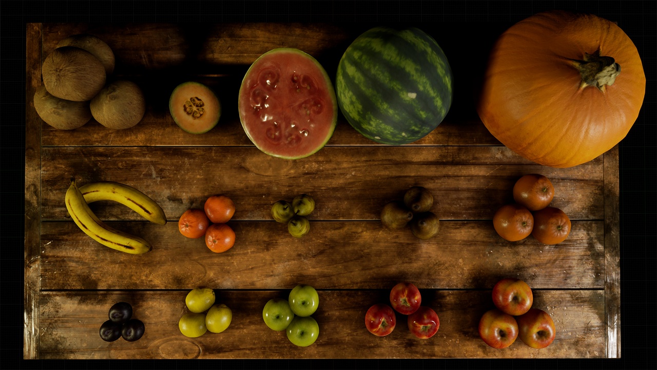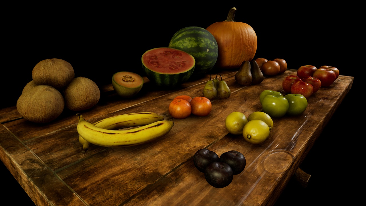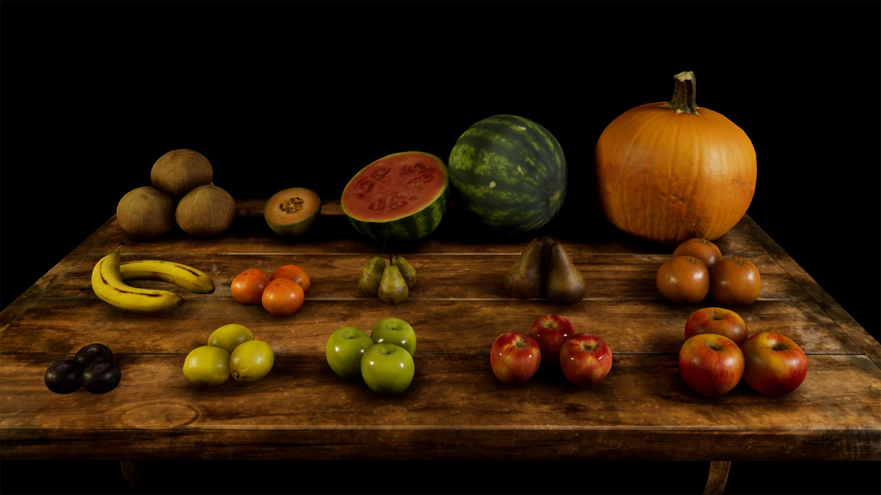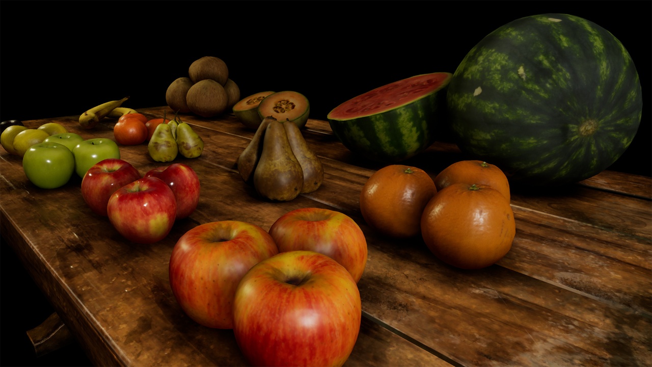 This set features 15 different pieces of professional quality, AAA ready fruit with 16 materials and 48 4k PBR textures, all of which were photo-scanned to achieve the most realistic result. The set also includes a wooden table, which is used in the demo scene.